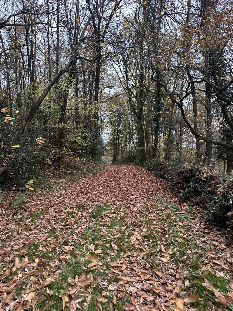 As we walked, I kicked through the fallen leaves.  I love the rustle they make, that soft crackling chorus under my boots.  Each leaf reminds me of its own quiet journey: falling, changing color, metamorphosing each passing day.  Then, just as I settle into that gentle rhythm, there’s the sudden thunder of Penny’s paws as she sprints past me – wild, alive, and fully in the moment.